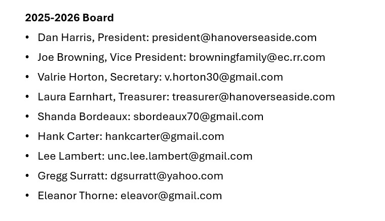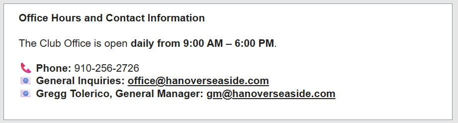 - 📧 Gregg Tolerico, General Manager: gm@hanoverseaside.com