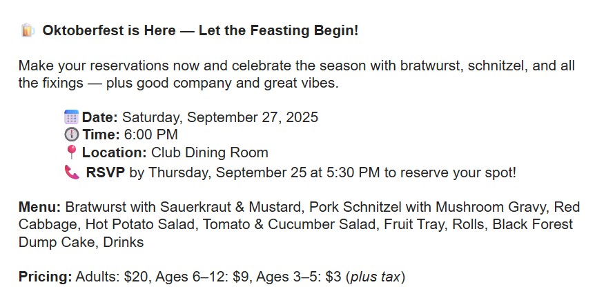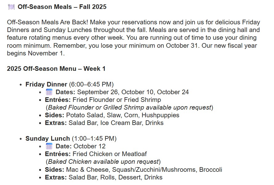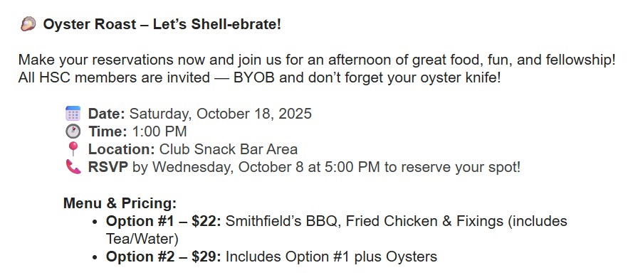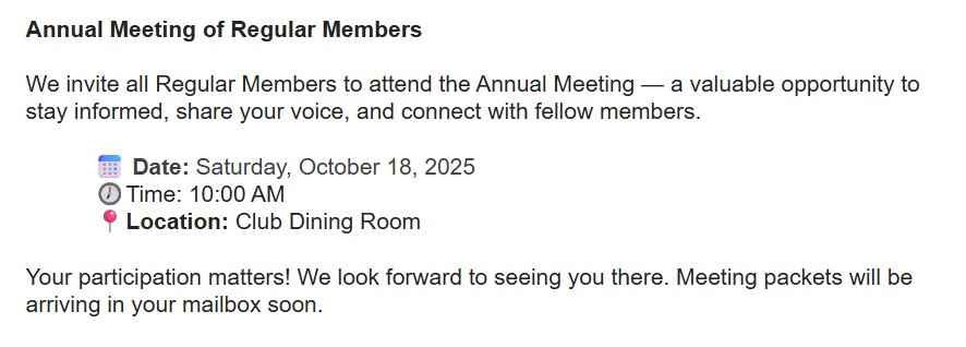 Save the Date: The next Annual Meeting is scheduled for Saturday, October 24, 2026, at 10:00 AM in the Club dining room. This date differs from what was discussed at the recent meeting due to a scheduling conflict with the Ironman Triathlon.