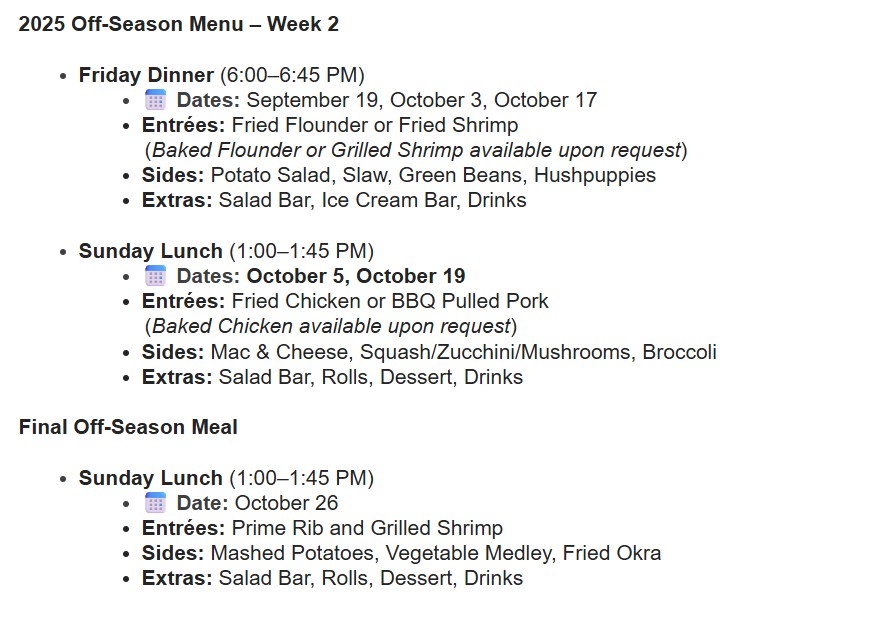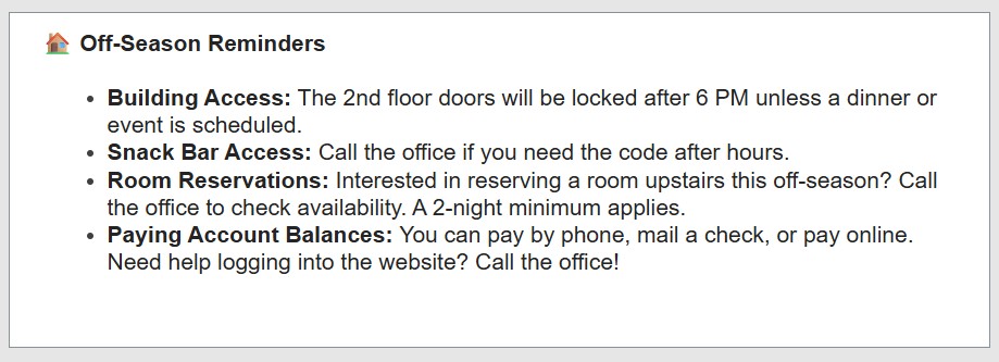 - Room Reservations: Interested in reserving a room upstairs this off-season? Call the office to check availability. A 2-night minimum applies.